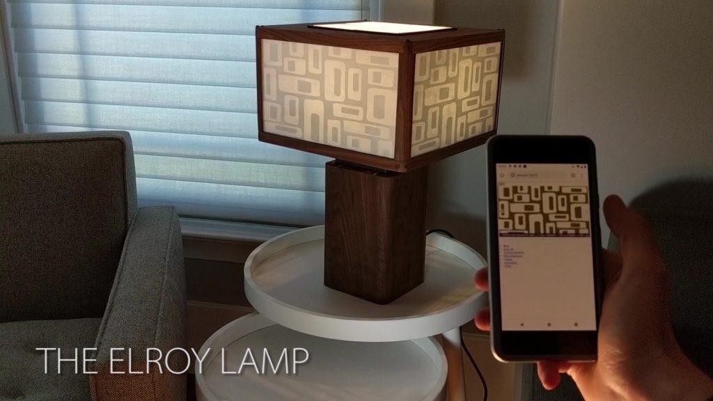 Elroy is a table lamp with a unique feature — the shade can dynamically change, at the swipe of a finger, to a new style or pattern to complement your mood, the time of day, or an event, all from your phone or web browser.